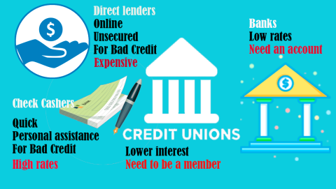 Where to get Personal Loans for Bad Credit: online direct lenders, check cashers, credit unions, banks.